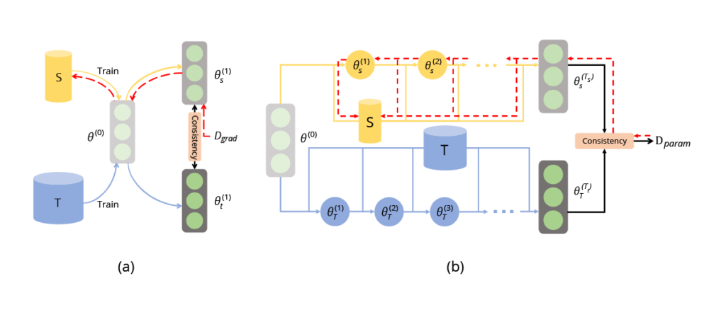 Fig. 5 (image source: [1]) (a) Single-step parameter matching. (b) Multi-step parameter matching. They optimize the consistency of trained model parameters using real data and synthetic data. For single-step parameter matching, it is equivalent to matching gradients. For multi-step parameter matching, it is also known as matching training trajectories.