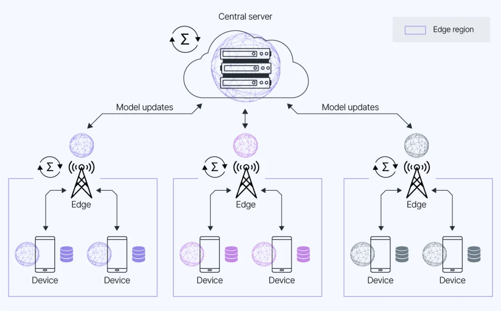 - Hierarchical Federated Learning (Hierarchical FL): This approach resembles the work of a jazz band with several levels of organization: first, musicians in one section synchronize with each other, and then combine into a single composition. In FL, data is aggregated at regional nodes, which send processed information to the central server. This reduces the load on the network and speeds up processing.